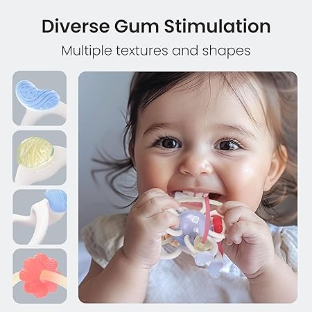 • 【DIVERSE GUM STIMULATION】Compared to regular single-textured teething toys, ours boasts a variety of shapes and textures, offering babies with diverse gum stimulation experiences throughout different teething stages. Additionally, our teether stands out for its liquid silicone rubber material, which is renowned for superior softness and provides a more gentle touch on gums, ensuring maximum comfort for your baby's teething experience.
