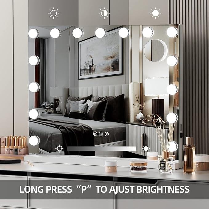 • ??Smart vanity mirror with Touch Sensors✨✨: Simply touch turn on/off sensor to light up make up mirror, and change the 3 color modes( warm/natural/cool) by touch “M” sensor, Dimmable brightness from 10-100% by touch “P” accordance with you need while applying makeup. Also the smart makeup mirror with Intelligent light memory function, it will keep the state of your last use