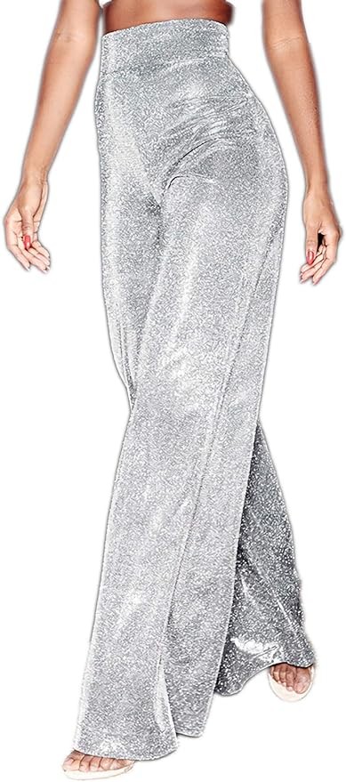 Velius Women's Sexy Metallic Sparkly Wide Leg Pants Trousers Clubwear